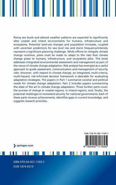 Rising sea levels and altered weather patterns are expected to significantly alter coastal and inland environments for humans, infrastructure and ecosystems. Potential land-use changes and population increases, coupled with uncertain predictions for sea level rise and storm frequency/intensity represent a significant planning challenge. While efforts to mitigate climate change continue, plans must be made to adapt to the risks that climate change poses to humans, infrastructure, and ecosystems alike. This book addresses integrated environmental assessment and management as part of the nexus of climate change adaptation. Risk analysis has emerged as a useful approach to guide assessment, communication and management of security risks. However, with respect to climate change, an integrated, multi-criteria, multi-hazard, risk-informed decision framework is desirable for evaluating adaptation strategies. The papers in Part 1 summarize societal and political needs for climate change adaptation. Part 2 includes papers summarizing the state of the art in climate change adaptation. Three further parts cover: the process of change in coastal regions, in inland regions, and, finally, the potential challenges to homeland security for national governments. Each of these parts reviews achievements, identifies gaps in current knowledge, and suggests research priorities.