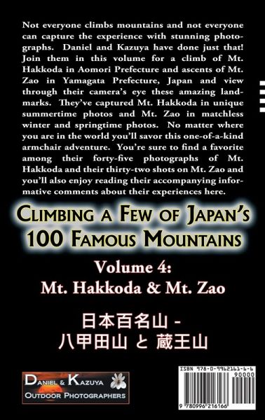 Not everyone climbs mountains and not everyone can capture the experience with stunning photographs. Daniel and Kazuya have done just that! Join them in this volume for a climb of Mt. Hakkoda in Aomori Prefecture and ascents of Mt. Zao in Yamagata Prefecture, Japan and view through their camera's eye these amazing landmarks. They've captured Mt. Hakkoda in unique summertime photos and Mt. Zao in matchless winter and springtime photos. No matter where you are in the world you'll savor this one-of-a-kind armchair adventure. You're sure to find a favorite among their forty-five photographs of Mt. Hakkoda and their thirty-two shots on Mt. Zao and you'll also enjoy reading their accompanying informative comments about their experiences here.