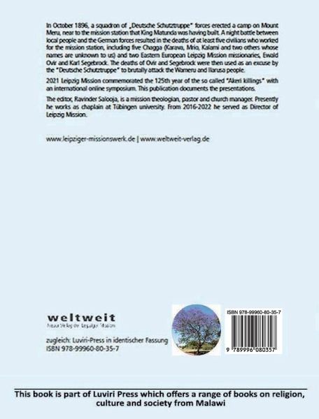 In October 1896, a squadron of "Deutsche Schutztuppe" forces erected a camp on Mount Mary, near to the mission station that King Matundo was having built. A night battle between local people and the German forces resulted in the deaths of at least five civilians who worked for the mission station, including five Chagga (Karava, Mria, Kalami and two others whose names are unknown to us) and two Eastern European Leipzig Mission missionaries, Ewold Ovir and Karl Segetrock. The deaths of Ovir and Segebrock were then used as an excuse by the "Deutsche Schutztruppe" to brutally attack the Womesu and Ilarusa people 2021 Leipzig Mission commemorated the 125th year of the so-called "Aker killings" with an international online symposium. This publication documents the presentations. This book was co-published with Leipzig Mission
