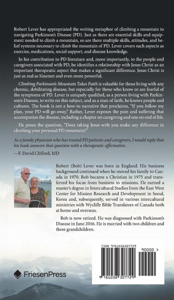 Robert Lever has appropriated the writing metaphor of climbing a mountain to navigating Parkinson's Disease (PD). Just as there are essential skills and equipment needed to climb a mountain, so are there multiple skills, attitudes, and belief systems necessary to climb the mountain of PD. Lever covers such aspects as exercise, medications, social support, and disease knowledge. In his contribution to PD literature and, more importantly, to the people and caregivers associated with PD, he identifies a relationship with Jesus Christ as an important therapeutic aspect that makes a significant difference. Jesus Christ is just as real as Sinemet and even more powerful. Climbing Parkinson's Mountain Takes Faith is valuable for those living with any chronic, debilitating disease, but especially for those who know or are fearful of the symptoms of PD. Lever is uniquely qualified, as a person living with Parkinson's Disease, to write on this subject, and as a man of faith, he knows people and cultures. The book is not a how-to narrative that proclaims, "If you follow my plan, your PD will go away." Rather, Lever exposes the pain and suffering that accompanies the disease, including a chapter on caregiving and one on end of life. He poses the question, "Does taking Jesus with you make any difference in climbing your personal PD mountain?" As a family physician who has treated PD patients and caregivers, I would reply that his book answers that question with a therapeutic affirmative. -F. David Clifford, MD