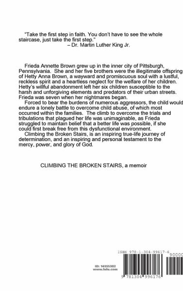 Frieda Annette Brown grew up in the inner city of Pittsburgh, Pennsylvania. She and her five brothers were the illegitimate offspring of Hetty Anna Brown, a wayward and promiscuous soul with a lustful, reckless spirit and a heartless neglect for the welfare of her children. Hetty's willful abandonment left her six children susceptible to the harsh and unforgiving elements and predators of their urban streets. Frieda was seven when her nightmares began. Forced to bear the burdens of numerous aggressors, the child would endure a lonely battle to overcome child abuse, of which most occurred within the families. The climb to overcome the trials and tribulations that plagued her life was unimaginable, as Frieda struggled to maintain belief that a better life was possible, if she could first break free from this dysfunctional environment. Climbing the Broken Stairs, is an inspiring true-life journey of determination, and an inspiring and personal testament to the mercy, power, and glory of God.