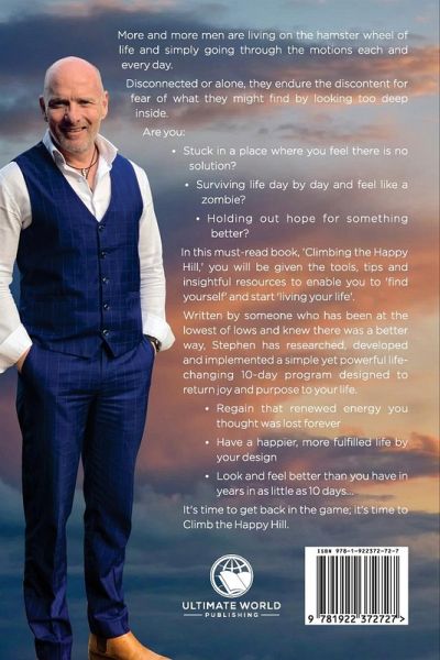More and more men are living on the hamster wheel of life and simply going through the motions each and every day. Disconnected or alone, they endure the discontent for fear of what they might find by looking too deep inside. Are you: · Stuck in a place where you feel there is no solution? · Surviving life day by day and feel like a zombie? · Holding out hope for something better? In this must-read book, 'Climbing the Happy Hill,' you will be given the tools, tips and insightful resources to enable you to 'find yourself' and start 'living your life'. Written by someone who has been at the lowest of lows and knew there was a better way, Stephen has researched, developed and implemented a simple yet powerful life-changing 10-day program designed to return joy and purpose to your life. · Regain that renewed energy you thought was lost forever · Have a happier, more fulfilled life by your design · Look and feel better than you have in years in as little as 10 days... It's time to get back in the game; it's time to Climb the Happy Hill.