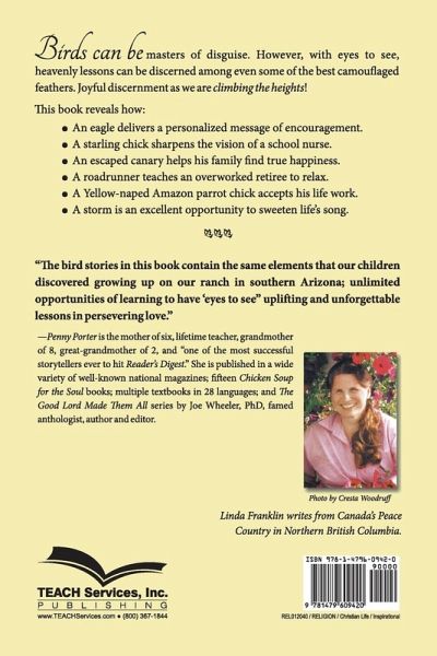 Birds can be masters of disguise. However, with eyes to see, heavenly lessons can be discerned among even some of the best camouflaged feathers. Joyful discernment as we are climbing the heights! This book reveals how: An eagle delivers a personalized message of encouragement. A starling chick sharpens the vision of a school nurse. An escaped canary helps his family find true happiness. A roadrunner teaches an overworked retiree to relax. A Yellow-naped Amazon parrot chick accepts his life work. A storm is an excellent opportunity to sweeten life’s song.