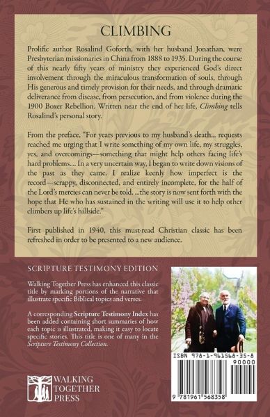 Prolific author Rosalind Goforth, with her husband Jonathan, were Presbyterian missionaries in China from 1888 to 1935. During the course of this nearly fifty years of ministry they experienced God's direct involvement through the miraculous transformation of souls, through His generous and timely provision for their needs, and through dramatic deliverance from disease, from persecution, and from violence during the 1900 Boxer Rebellion. Written near the end of her life, Climbing tells Rosalind's personal story. From the preface, "For years previous to my husband's death... requests reached me urging that I write something of my own life, my struggles, yes, and overcomings-something that might help others facing life's hard problems.... In a very uncertain way, I began to write down visions of the past as they came. I realize keenly how imperfect is the record-scrappy, disconnected, and entirely incomplete, for the half of the Lord's mercies can never be told. ...the story is now sent forth with the hope that He who has sustained in the writing will use it to help other climbers up life's hillside." First published in 1940, this must-read Christian classic has been refreshed in order to be presented to a new audience. About the Scripture Testimony Edition Walking Together Press has enhanced this classic title by identifying and marking portions of the narrative that illustrate specific Biblical topics and verses. An extensive Scripture Testimony Index appendix has also been added, containing short summaries of how each topic is illustrated, making locating specific stories easy. Furthermore, this title is one of many in the Scripture Testimony Collection.