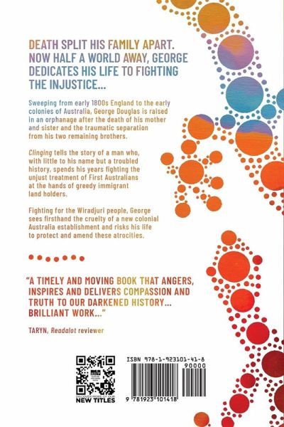 DEATH SPLIT HIS FAMILY APART. NOW HALF A WORLD AWAY, GEORGE DEDICATES HIS LIFE TO FIGHTING THE INJUSTICE... Sweeping from early 1800s England to the early colonies of Australia, George Douglas is raised in an orphanage after the death of his mother and sister and the traumatic separation from his two remaining brothers. Clinging tells the story of a man who, with little to his name but a troubled history, spends his years fighting the unjust treatment of First Australians at the hands of greedy immigrant land holders. Fighting for the Wiradjuri people, George sees firsthand the cruelty of a new colonial Australia establishment and risks his life to protect and amend these atrocities. "A timely and moving book that angers, inspires and delivers compassion and truth to our darkened history... Brilliant work..." Taryn, Readalot reviewer
