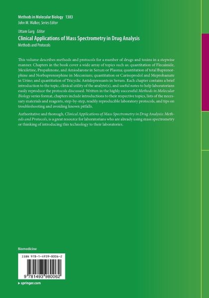 Mass Spectrometry in Clinical Laboratory: Applications in Therapeutic Drug Monitoring and Toxicology.- Quantitation of Flecainide, Mexiletine, Propafenone, and Amiodarone in Serum or Plasma Using Liquid Chromatography-Tandem Mass Spectrometry (LC-MS/MS).- Quantitation of the Oral Anticoagulants Dabigatran, Rivaroxaban, Apixaban, and Warfarin in Plasma Using Ultra-Performance Liquid Chromatography with Tandem Mass Spectrometry (UPLC-MS/MS).- Simultaneous Quantitation of Lamotrigine, Levetiracetam, 10-Hydroxycarbazepine, Topiramate, and Zonisamide in Serum Using HPLC-MS/MS .- Quantification of the Triazole Antifungal Compounds Voriconazole and Posaconazole in Human Serum or Plasma Using Liquid Chromatography Electrospray Tandem Mass Spectrometry (HPLC-ESI-MS/MS).- Quantitation of Haloperidol, Fluphenazine, Perphenazine, and Thiothixene in Serum or Plasma Using Liquid Chromatography-Tandem Mass Spectrometry (LC-MS/MS).- Quantitation of Total Buprenorphine and Norbuprenorphine in Meconium by LC-MS/MS.- Quantitation of Buprenorphine, Norbuprenorphine, Buprenorphine Glucuronide, Norbuprenorphine Glucuronide, and Naloxone in Urine by LC-MS/MS.- A Simple Liquid Chromatography Tandem Mass Spectrometry Method for Quantification of Plasma Busulfan.- High-Throughput Quantitation of Busulfan in Plasma Using Ultra-Fast Solid Phase Extraction Tandem Mass Spectrometry (SPE-MS/MS).- Quantification of 11-Carboxy-Delta-9-Tetrahydrocannbinol (THC-COOH) in Meconium Using Gas Chromatography Mass Spectrometry (GC/MS).- Quantitation of Carisoprodol and Meprobamate in Urine and Plasma Using Liquid Chromatography-Tandem Mass Spectrometry (LC-MS/MS).- Cetirizine Quantification by High Performance Liquid Chromatography Tandem Mass Spectrometry (LC/MS/MS).- Quantification of Docetaxel in Serum UsingTurbulent Flow Liquid Chromatography Electrospray Tandem Mass Spectrometry (TFC-HPLC-ESI-MS/MS).- Comprehensive Urine Drug Screen by Gas-Chromatography Mass Spectrometry (GC/MS).- Broad Spectrum Drug Screening Using Liquid Chromatography-Hybrid Triple Quadrupole Linear Ion Trap Mass Spectrometry.- High Resolution Mass Spectrometry for Untargeted Drug Screening.- Quantitation of Ethyl Glucuronide and Ethyl Sulfate in Urine Using Liquid Chromatography-Tandem Mass Spectrometry(LC-MS/MS).- Quantification of Hydroxychloroquine in Blood Using Turbulent Flow Liquid Chromatography-Tandem mass Soectrometry (TFLC-MS/MS).- Quantification of Iohexol in Serum by High Performance Liquid Chromatography Tandem Mass Spectrometry (LC-MS/MS).- Quantitation of Teriflunomide in Human Serum/Plasma Across a 40,000-Fold Concentration Range by LC/MS/MS.- Determination of Menthol in Plasma and Urine by Gas Chromatography-Mass Spectrometry (GC/MS).- Development of an Assay for Methotrexate and its Metabolites 7-Hydroxy Methotrexate and DAMPA in Serum by LC-MS/MS.- Quantitative, Multidrug Pain Medication Testing by Liquid Chromatography - Tandem Mass Spectrometry (LC-MSMS).- Quantification of Free Phenytoin by Liquid Chromatography Tandem Mass Spectrometry (LC/MS/MS).- Detection of Stimulants and Narcotics by Liquid Chromatography Tandem Mass Spectrometry and Gas Chromatography Mass Spectrometry for Sports Doping Control.- Quantification of Tricyclic Antidepressants in Serum Using Liquid Chromatography Electrospray Tandem Mass Spectrometry (HPLC-ESI-MS/MS).