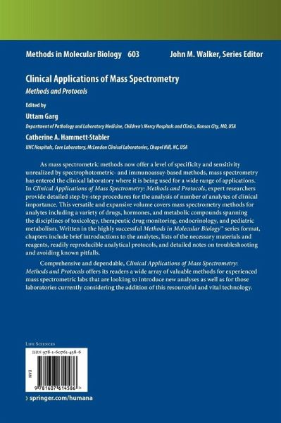 "Clinical Applications of Mass Spectrometry Methods and Protocols is a compilation of ready-to-use protocols for the determination of clinically relevant analytes in various biological matrices. ... the book is a straightforward compilation of diverse protocols written in a very user-friendly format. It is especially valuable for labs that have just started implementing mass spectrometry or for those planning to do so in the near future. For labs with more experience in mass spectrometry, the protocols can save many hours of precious method development time." (Robert Jansen, Journal of the American Society for Mass Spectrometry, Vol. 22, 2011)