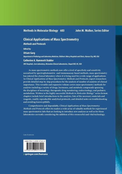 "Clinical Applications of Mass Spectrometry Methods and Protocols is a compilation of ready-to-use protocols for the determination of clinically relevant analytes in various biological matrices. ... the book is a straightforward compilation of diverse protocols written in a very user-friendly format. It is especially valuable for labs that have just started implementing mass spectrometry or for those planning to do so in the near future. For labs with more experience in mass spectrometry, the protocols can save many hours of precious method development time." (Robert Jansen, Journal of the American Society for Mass Spectrometry, Vol. 22, 2011)