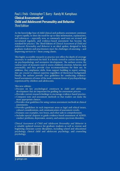 This textbook is organized into three sections, consistent with the authors' approach to teaching. Part I provides students with the psychological knowledge base necessary for modern assessment practice, including historical perspectives, measurement science, child psychopathology, ethical, legal, and cultural issues, and the basics of beginning the assessment process. Part II gives students a broad review of the specific assessment methods used by psychologists, accompanied by specific advice regarding the usage and strengths and weaknesses of each method. In Part III, we help students perform some of the most sophisticated of assessment practices: integrating and communicating assessment results and infusing assessment practice with knowledge of child development and psychopathology to assess some of the most common types of behavioral and emotional disorders in youth.
