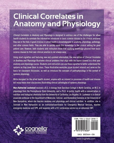 Clinical Correlates in Anatomy and Physiology is designed to address one of the challenges for allied health students to correlate the information introduced in basic science classes to the clinical problems they see in the field. A good clinician in allied health is knowledgeable in anatomy, physiology, pathology, and other science fields. They are able to quickly apply this knowledge to the clinical setting for good patient care. However, both students and instructors know that applying knowledge gleaned from basic science classes to their own clinical practice is not always easy. Using short vignettes and featuring new and updated information, the new edition of Clinical Correlates in Anatomy and Physiology illustrates clinical problems that align with the topics covered in a first year anatomy and physiology course. Students and instructors can use these vignettes to better understand the systems as they cover them in class. These illustrative examples pique student interest and serve as the basis for classroom discussion, as well as introduce the concepts of pathophysiology in the context of systems physiology. While designed for the allied health student, anyone with an interest in processes of health and disease will enjoy these short discussions illustrating clinical pathologies of systems physiology. Mary Katherine Lockwood received a B.S. in biology from Davidson College in North Carolina, an M.S. in physiology from the Pennsylvania State University, and a Ph.D. in public health with a concentration in nutrition and biological chemistry from the University of California, Los Angeles. Dr. Lockwood is a clinical associate professor in the Department of Molecular, Cellular, and Biomedical Sciences at the University of New Hampshire, where she teaches anatomy and physiology and clinical nutrition. In addition, she is licensed in New Hampshire as an instructor/coordinator for Emergency Medical Services, teaches emergency medicine and CPR, and responds with a 911 ambulance service as an advanced EMT.