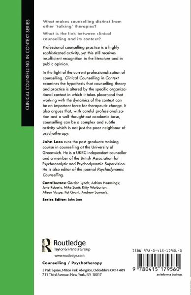 1. What is clinical counselling in context? John Lees University of Greenwich 2. Towards a pragmatic approach to clinical counselling in context Dr Gordon Lynch University College Chester 3. Assessment of psychological change Dr Adrian Hemmings University of Sussex 4. The sophistication of time-limited work in context June Roberts Westminster Pastoral Foundation 5. The problem-solving pilgrim Dr Mike Scott University of Manchester 6. Establishing a therapeutic frame Kitty Warburton De Montfort University 7. The therapeutic space and the therapeutic relationship Alison Vaspe Marylebone Health Centre 8. Issues of difference in staff teams and client work Pat Grant University of Greenwich 9. A responsible way to work Professor Andrew Samuels University of Essex