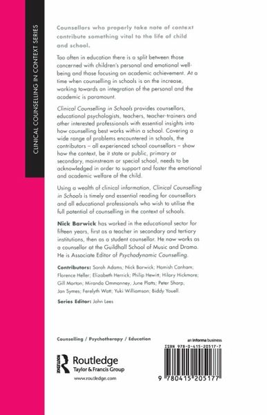 Too often in education there is a split between those concerned with children's personal and emotional wellbeing and those focusing on academic achievement. At a time when counselling in schools is on the increase, working towards an integration of the personal and the academic is paramount. Clinical Counselling in Schools provides counsellors, educational psychologists, teachers, teacher-trainers and other interested professionals with essential insights into how counselling best works within a school. Covering a wide range of problems encountered in schools, the contributors - all experienced school counsellors show how the context, be it state or public, primary or secondary, mainstream or special school, needs to be acknowledged in order to support and foster the emotional and academic welfare of the child. Using a wealth of clinical information, Clinical Counselling in Schools is timely and essential reading for counsellors and all educational professionals who wish to utilise the full potential of counselling in the context of schools.