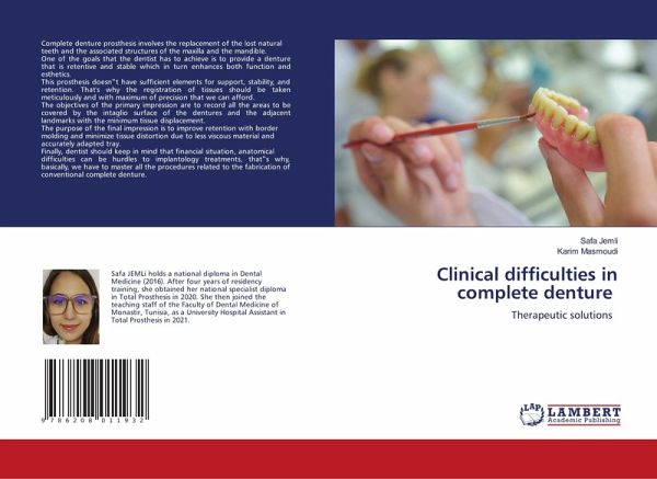 Complete denture prosthesis involves the replacement of the lost naturalteeth and the associated structures of the maxilla and the mandible.One of the goals that the dentist has to achieve is to provide a denture that is retentive and stable which in turn enhances both function and esthetics.This prosthesis doesn t have sufficient elements for support, stability, and retention. That's why the registration of tissues should be taken meticulously and with maximum of precision that we can afford.The objectives of the primary impression are to record all the areas to be covered by the intaglio surface of the dentures and the adjacent landmarks with the minimum tissue displacement.The purpose of the final impression is to improve retention with bordermolding and minimize tissue distortion due to less viscous material andaccurately adapted tray.Finally, dentist should keep in mind that financial situation, anatomicaldifficulties can be hurdles to implantology treatments, that s why, basically, we have to master all the procedures related to the fabrication of conventional complete denture.