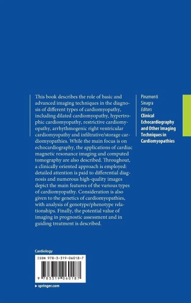 This book describes the role of basic and advanced imaging techniques in the diagnosis of different types of cardiomyopathy, including dilated cardiomyopathy, hypertrophic cardiomyopathy, restrictive cardiomyopathy, arrhythmogenic right ventricular cardiomyopathy and infiltrative/storage cardiomyopathies. While the main focus is on echocardiography, the applications of cardiac magnetic resonance imaging and computed tomography are also described. Throughout, a clinically oriented approach is employed: detailed attention is paid to differential diagnosis and numerous high-quality images depict the main features of the various types of cardiomyopathy. Consideration is also given to the genetics of cardiomyopathies, with analysis of genotype-phenotype relationships. Finally, the potential value of imaging in prognostic assessment and in guiding treatment is described.
