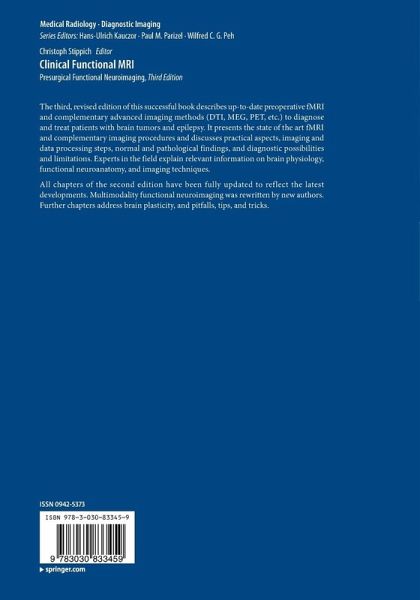 The third, revised edition of this successful book describes up-to-date preoperative fMRI and complementary advanced imaging methods (DTI, MEG, PET, etc.) to diagnose and treat patients with brain tumors and epilepsy. It presents the state of the art fMRI and complementary imaging procedures and discusses practical aspects, imaging and data processing steps, normal and pathological findings, and diagnostic possibilities and limitations. Experts in the field explain relevant information on brain physiology, functional neuroanatomy, and imaging techniques.