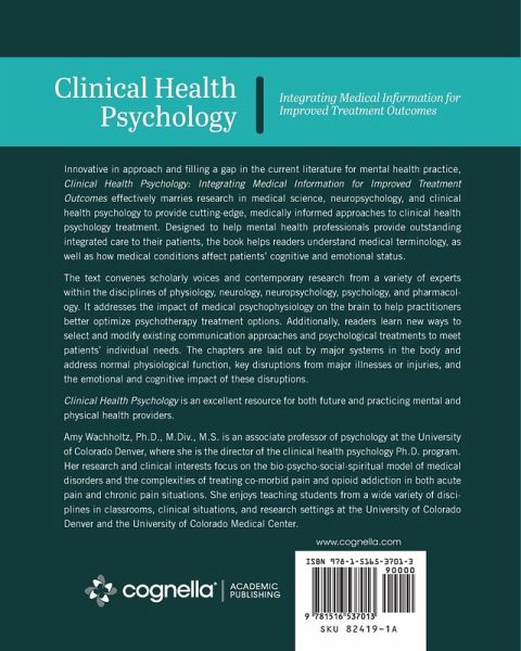 Innovative in approach and filling a gap in the current literature for mental health practice, Clinical Health Psychology: Integrating Medical Information for Improved Treatment Outcomes effectively marries research in medical science, neuropsychology, and clinical health psychology to provide cutting-edge, medically informed approaches to clinical health psychology treatment. Designed to help mental health professionals provide outstanding integrated care to their patients, the book helps readers understand medical terminology, as well as how medical conditions affect patients' cognitive and emotional status. The text convenes scholarly voices and contemporary research from a variety of experts within the disciplines of physiology, neurology, neuropsychology, psychology, and pharmacology. It addresses the impact of medical psychophysiology on the brain to help practitioners better optimize psychotherapy treatment options. Additionally, readers learn new ways to select and modify existing communication approaches and psychological treatments to meet patients' individual needs. The chapters are laid out by major systems in the body and address normal physiological function, key disruptions from major illnesses or injuries, and the emotional and cognitive impact of these disruptions. Clinical Health Psychology is an excellent resource for both future and practicing mental and physical health providers. Amy Wachholtz, Ph.D., M.Div., M.S. is an associate professor of psychology at the University of Colorado Denver, where she is the director of the clinical health psychology Ph.D. program. Her research and clinical interests focus on the bio-psycho-social-spiritual model of medical disorders and the complexities of treating of co-morbid pain and opioid addiction in both acute pain and chronic pain situations. She enjoys teaching students from a wide variety of disciplines in classrooms, clinical situations, and research settings at the University of Colorado Denver and the University of Colorado Medical Center.