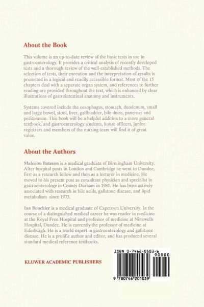1. Intubation.- Method.- Tubes.- Complications.- 2. Upper digestive endoscopy.- Instruments.- Procedure.- Endoscopic retrograde cholangiopancreatography.- Cleansing.- Prophylaxis of S.A.B.E..- 3. Gastrointestinal bleeding.- Occult blood tests.- Gastrointestintal bleeding in liver disease.- 4. Oesophagus.- Oesophageal acid perfusion test.- Oesophagoscopy.- Histology.- Radiology.- Manometry.- Reflux studies.- Isotope swallow.- 5. Stomach and duodenum.- Gastric emptying.- Gastric acid secretion.- Other gastric secretions.- Other tests.- Campylobacter-like organisms.- 6. Absorption.- Fats and related substances.- Monosaccharides.- Rare disorders of absorption.- 7. Small intestine.- Intestinal biopsy.- Interpretation.- Radiology.- Radioisotope studies.- Protein loss.- Intestinal bacteria.- Intestinal motility and manometry.- Markers.- Crohn's disease.- Metabolic disorders.- Immunology.- 8. Colon and rectum.- Rectal examination.- Anoscopy (proctoscopy).- Proctosigmoidoscopy.- Flexible sigmoidoscopy.- Rectal biopsy.- Radiology.- Arteriography.- Colonoscopy.- Manometry.- Immunology.- 9. Stool examination and microbiology.- Macroscopic appearance.- Protozoa and helminths.- Bacteria.- Viruses.- 10. Pancreas.- Ultrasonography.- Endoscopic retrograde cholangiopancreatography.- Computed tomography.- Angiography.- Other radiology.- Peritoneoscopy.- Cytology.- Hormonal tests of pancreatic exocrine function.- Lundh test.- Tubeless oral pancreatic function tests.- Digestive enzymes outside the gut.- Other blood tests.- Stool examination.- Sweat electrolytes.- Gut endocrinology.- Insulinoma.- 11. Liver biochemistry.- Blood and urine tests.- Proteins.- Other tests.- Alcoholic liver disease.- Immunology.- Kinetic tests.- Idiopathic haemochromatosis.- Wilson's disease (hepatolenticulardegeneration).- Hyatid disease.- 12. Liver biopsy.- Preparation.- Procedure.- Aftercare.- Complications.- Indications.- Contradictions.- Interpretation.- Liver aspiration.- 13. Liver imaging and manometry.- Ultrasonic scanning.- Isotope scanning.- Diagnosis of cholestasis.- Portal manometry and splenoportography.- Portography.- 14. Gallbladder and bile ducts.- Plain abdominal radiograph.- Oral cholecystography.- Ultrasonography.- Iodine cholangiography.- Bile duct ultrasound.- Computed tomography.- Isotope scanning.- Operative and post-operative cholangiography.- Biliary physiology.- Bacteriology.- 15. Ascites and the peritoneum.- Abdominal paracentesis.- Chylous ascites.- Peritoneal biopsy.- Peritoneoscopy.- Further reading.