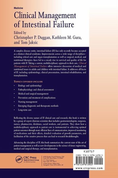 A complex disease entity, intestinal failure (IF) has only recently become accepted as a distinct clinical syndrome. Improvements across a wide range of disciplines-including critical care and organ transplantation as well as surgical, medical, and nutritional therapies-have led to a steady rise in survival and quality of life for patients with IF. Taking a current, multidisciplinary approach to their care, Clinical Management of Intestinal Failure offers intensive discussion of medical and nutritional issues in adults and children with intestinal failure. It addresses all facets of IF, including epidemiology, clinical presentation, intestinal rehabilitation, and transplantation. Topics covered include: Etiology and epidemiology Pathophysiology and clinical assessment Medical and surgical management Prevention and treatment of complications Nursing management Emerging diagnostic and therapeutic methods Long-term care Reflecting the diverse nature of IF clinical care and research, this book is written by a group of expert clinician scientists that includes gastroenterologists, surgeons, nurses, pharmacists, dietitians, social workers, and patients. They show how a multidisciplinary approach to patient care is instrumental in achieving optimal patient outcomes through more efficient lines of communication, improved monitoring of medications and their effects, detailed evaluation of growth parameters, and facilitation of the creative process that can lead to research breakthroughs. Advancing the discipline of IF, this book summarizes the current state of the art of patient management as well as new developments in the science of tissue engineering, medical and surgical therapy, and transplantation.