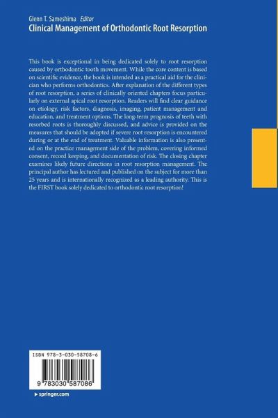 Introduction to Root Resorption.- Types of Root Resorption.- Etiology of Root Resorption.- Diagnosis of Root Resorption.- Risk Factors for Root Resorption.- Imaging of Root Resorption.- Patient Management and Education of Root Resorption.- Treatment Options for Root Resorption.- Long-Term Prognosis of Root Resorption.- Resorption of Impacted Teeth.- Root Resorption: Future Directions.