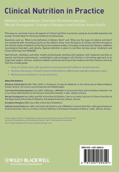 This easy-to-use book covers all aspects of clinical nutrition in practice, using an accessible question and answer format ideal for the busy healthcare professional. Questions such as 'What is the definition of dietary fibre?' and 'What are the types of enteral nutrition?' are answered with refreshing clarity as the authors move from the basics of human nutrition through to the clinical needs of patients suffering various disease states, including cardiovascular disease, diabetes, neurological disorders and obesity. Special attention is given to nutrition during cancer treatment and those suffering from HIV/AIDS. Nutritionists, dietitians and other health professionals working with patients with impaired nutrition or special nutritional requirements, cardiologists and oncologists will find this a refreshing approach to an important subject. Nurses, medical students and those working in the medical nutrition industry will also find this a handy guide. * Easy-to-follow style with questions clearly posed and evidence-based answers. * Outlines the basics of health and nutrition before addressing individual disease states. * Written by practitioners, for practitioners.