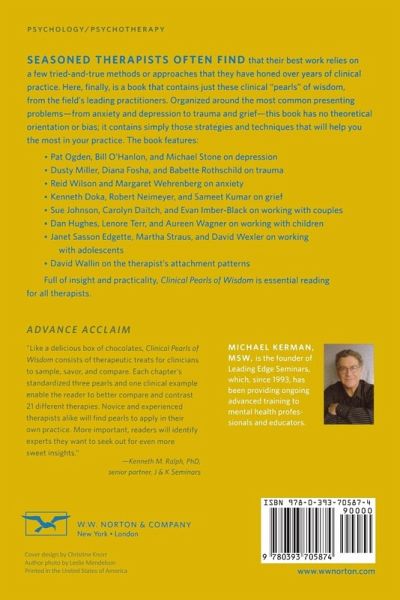 Here, for your reading and clinical pleasure, is a book that contains just these clinical "pearls" of wisdom, from the field's leading practitioners. Represented in this collection is the "take-away" message from some of the most popular conference presenters active in the field today. It covers a rich range of perspectives on the most common presenting problems: depression, trauma, anxiety, grief, couples issues, and child and adolescent difficulties. Each entry follows a similar 3-part format. First is the pearls, a brief listing of three clinical pearls based on feedback the author has received over the years from colleagues, students, book reviewers, and workshop participants. Next is the case example, a presentation of a case that best exemplifies the "pearls" in action. This section also includes an analysis by the author-why they did what they did and what they thought about it then, and now. Finally, each author provides a series of concluding remarks about the preceding material and offers readers a sense of their thinking behind their clinical work, and how this approach might be integrated into other people's client work. These innovative practices and tools will enlarge your therapeutic repertoire, and complement your existing knowledge base. Contributors: Pat Ogden, Bill O'Hanlon, and Michael Stone on depression Dusty Miller, Diana Fosha, and Babette Rothschild on trauma Reid Wilson and Margaret Wehrenberg on anxiety Kenneth Doka, Robert Neimeyer, and Sameet Kumar on grief Sue Johnson, Carolyn Daitch, and Evan Imber-Black on working with couples Dan Hughes, Lenore Terr, and Aureen Wagner on working with children Janet Edgette, Martha Straus, and David Wexler on working with adolescents David Wallin on the therapist's attachment patterns