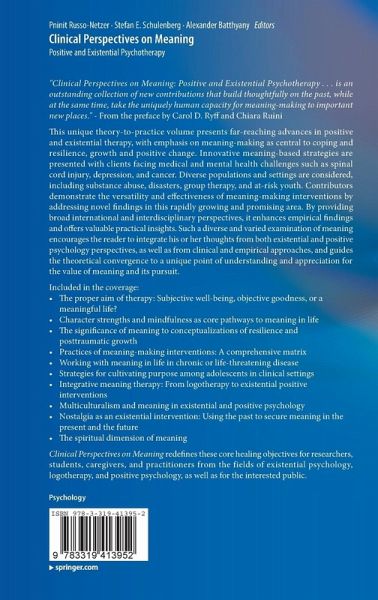 "Clinical Perspectives on Meaning: Positive and Existential Psychotherapy . . . is an outstanding collection of new contributions that build thoughtfully on the past, while at the same time, take the uniquely human capacity for meaning-making to important new places." - From the preface by Carol D. Ryff and Chiara Ruini