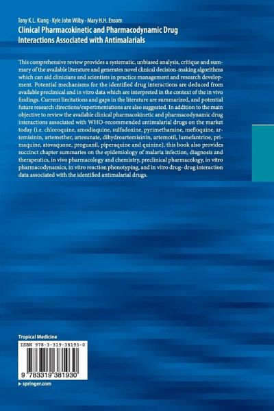 This comprehensive review provides a systematic, unbiased analysis, critique and summary of the available literature and generates novel clinical decision-making algorithms which can aid clinicians and scientists in practice management and research development. Potential mechanisms for the identified drug interactions are deduced from available preclinical and in vitro data which are interpreted in the context of the in vivo findings. Current limitations and gaps in the literature are summarized, and potential future research directions / experimentations are also suggested. In addition to the main objective to review the available clinical pharmacokinetic and pharmacodynamic drug interactions associated with WHO-recommended antimalarial drugs on the market today (i.e. chloroquine, amodiaquine, sulfadoxine, pyrimethamine, mefloquine, artemisinin, artemether, artesunate, dihydroartemisinin, artemotil, lumefantrine, primaquine, atovaquone, proguanil, piperaquine and quinine), this book also provides succinct chapter summaries on the epidemiology of malaria infection, diagnosis and therapeutics, in vivo pharmacology and chemistry, preclinical pharmacology, in vitro pharmacodynamics, in vitro reaction phenotyping, and in vitro drug-drug interaction data associated with the identified antimalarial drugs.