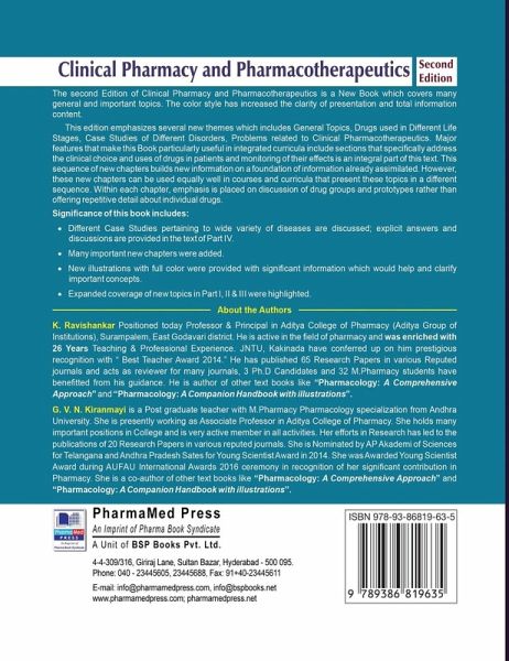 The second Edition of Clinical Pharmacy and Pharmacotherapeutics is a New Book which covers many general and important topics. The color style has increased the clarity of presentation and total information content. This edition emphasizes several new themes which includes General Topics, Drugs used in Different Life Stages, Case Studies of Different Disorders, Problems related to Clinical Pharmacotherapeutics. Major features that make this Book particularly useful in integrated curricula include sections that specifically address the clinical choice and uses of drugs in patients and monitoring of their effects is an integral part of this text. This sequence of new chapters builds new information on a foundation of information already assimilated. However, these new chapters can be used equally well in courses and curricula that present these topics in a different sequence. Within each chapter, emphasis is placed on discussion of drug groups and prototypes rather than offering repetitive detail about individual drugs. Significance of this book includes: Different Case Studies pertaining to wide variety of diseases are discussed; explicit answers and discussions are provided in the text of Part IV. Many important new chapters were added. New illustrations with full color were provided with significant information which would help and clarify important concepts. Expanded coverage of new topics in Part I, II & III were highlighted