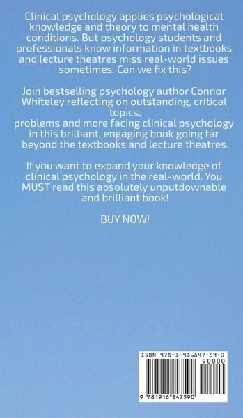 Clinical psychology applies psychological knowledge and theory to mental health conditions. But psychology students and professionals know information in textbooks and lecture theatres miss real-world issues sometimes. Can we fix this? Join bestselling psychology author Connor Whiteley reflecting on outstanding, critical topics, problems and more facing clinical psychology in this brilliant, engaging book going far beyond the textbooks and lecture theatres. If you want to expand your knowledge of clinical psychology in the real-world. You MUST read this absolutely unputdownable and brilliant book! BUY NOW! Clinical Psychology Reflections Volume 5 Includes Introduction Returning To Clinical Psychology As A New Person Helping Yourself By Helping Others An Update On How Anger Drives Action Mental Health Conditions As Reactions Trauma As Normal Reactions To Abnormal Situations A Statistics And Artificial Intelligence Rant And How It Relates To Clinical Psychology? Transformation Through Trauma Importance Of Exploring Other Therapies, Explaining Yourself To A Client And More Meaning Of The Word Trauma, Doing Identity Work With Clients And More The Key Metaphor For Friendships, Identities And Who We Are The Stupidity Of Out Of Area Placements Are All Barriers In Clinical Psychology The Same Heights? In Vulnerable Times We Remember What Others Say What's Missing From Mental Health Campaigns? Be Sure To Intellectually Gaslight Someone How Do We Make Psychology Research Matter? What Do You Want To Be Known For On Social Media? Could Inclusive-Language Be Important In The ADOS And Other Mental Health Settings? Do Clinical Psychology Complaint Procedures Need To Become Easier? An Updated Look At Endings In Therapy