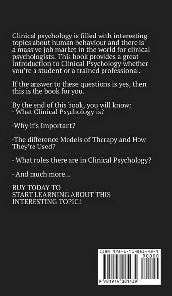 Clinical psychology is filled with interesting topics about human behaviour and there is a massive job market in the world for clinical psychologists. This book provides a great introduction to Clinical Psychology whether you're a student or a trained professional. So...Do you want to learn about clinical psychology? Do you want to learn about models of therapies? Do you want to learn about formulation and more? If the answer to these questions is yes, then this is the book for you. As this book explains a wide range of clinical psychology is an easy to understand way. By the end of this book, you will know:What Clinical Psychology is? Why it's Important? The Difference Models of Therapy and How They're Used? What Roles there are in Clinical Psychology? And much more... BUY TODAY TO START LEARNING ABOUT THIS INTERESTING TOPIC! If you like this book, then you will like Abnormal Psychology 2nd Edition as well. Clinical Psychology Content: Introduction Part 1: Introduction to Clinical Psychology What is Clinical Psychology? Key concepts in Clinical Psychology Influences in Clinical Psychology Populations and Settings Part 2: Models of Therapy Models of Therapy Compassion Focus Therapy Third Wave of CBT Part 3: Intervention and Assessment Intervention Assessment Part 4: Formulation Introduction to Formulation Types of Formulation ABC Technique/ Tool Part 5: Research and Additional Roles Research in Clinical Psychology Additional Roles in Clinical psychology