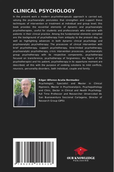 In the present work a modern psychotherapeutic approach is carried out, valuing the psychoanalytic postulates that strengthen and support these techniques of intervention or treatment at individual and group level; this book provides the essential elements of dynamic and psychoanalytic psychotherapies, useful for students and professionals who intervene with patients in their clinical practice. Among the fundamental elements compiled are the background of psychotherapy from antiquity to the present day, as well as highlighting advances in both dynamic clinical psychology and psychoanalytic psychotherapy; The processes of clinical intervention with brief psychotherapy, support psychotherapy, time-limited psychotherapy, psychoanalytic psychotherapy, crisis intervention processes, psychoanalytic group psychotherapy with its respective components, psychotherapy focused on transference, psychotherapy of forgiveness, the figure of the psychotherapist and his patient, psychotherapy in its opportune moment are described; all this with the purpose of seeking solutions to mild conflicts, neurosis, personality disorders, both individual, couple and family.