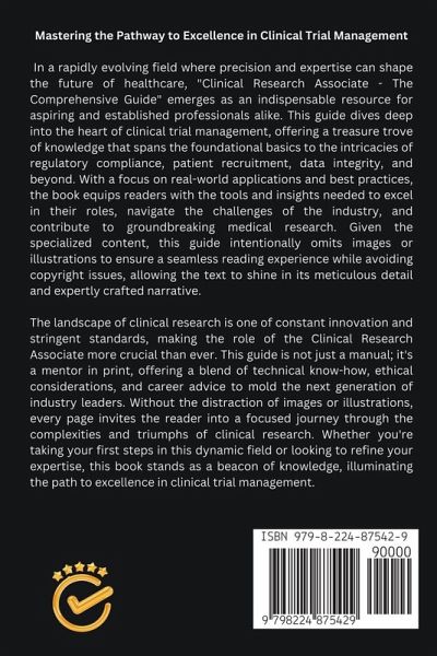 Mastering the Pathway to Excellence in Clinical Trial Management In a rapidly evolving field where precision and expertise can shape the future of healthcare, "Clinical Research Associate - The Comprehensive Guide" emerges as an indispensable resource for aspiring and established professionals alike. This guide dives deep into the heart of clinical trial management, offering a treasure trove of knowledge that spans the foundational basics to the intricacies of regulatory compliance, patient recruitment, data integrity, and beyond. With a focus on real-world applications and best practices, the book equips readers with the tools and insights needed to excel in their roles, navigate the challenges of the industry, and contribute to groundbreaking medical research. Given the specialized content, this guide intentionally omits images or illustrations to ensure a seamless reading experience while avoiding copyright issues, allowing the text to shine in its meticulous detail and expertly crafted narrative. The landscape of clinical research is one of constant innovation and stringent standards, making the role of the Clinical Research Associate more crucial than ever. This guide is not just a manual; it's a mentor in print, offering a blend of technical know-how, ethical considerations, and career advice to mold the next generation of industry leaders. Without the distraction of images or illustrations, every page invites the reader into a focused journey through the complexities and triumphs of clinical research. Whether you're taking your first steps in this dynamic field or looking to refine your expertise, this book stands as a beacon of knowledge, illuminating the path to excellence in clinical trial management.