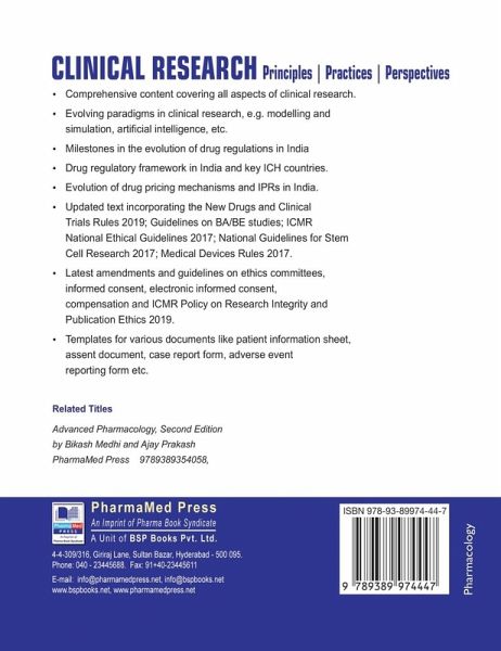 · Comprehensive content covering all aspects of clinical research. · Evolving paradigms in clinical research, e.g. modelling and simulation, artificial intelligence, etc. · Milestones in the evolution of drug regulations in India · Drug regulatory framework in India and key ICH countries. · Evolution of drug pricing mechanisms and IPRs in India. · Updated text incorporating the New Drugs and Clinical Trials Rules 2019; Guidelines on BA/BE studies; ICMR National Ethical Guidelines 2017; National Guidelines for Stem Cell Research 2017; Medical Devices Rules 2017. · Latest amendments and guidelines on ethics committees, informed consent, electronic informed consent, compensation and ICMR Policy on Research Integrity and Publication Ethics 2019. · Templates for various documents like patient information sheet, assent document, case report form, adverse event reporting form etc.