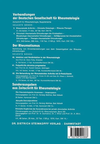 In numerous puplications the results of synovectomy have been written about where either one or another viewpoint have been examined. In this publication, the attempt is made to collect as many parameters as possible so as to get a most objective picture of the therapeutic worth by studying 100 knee and 370 finger synovectomies. During the survey, among other points, the following important aspects were taken under consideration: The operative results were not evaluated by the operating surgeon, but by a rheumatologist who was not on the clinic staff. As is well known, it is difficult to evaluate the X-ray picture objectively, since very often "subjective impressions" prevail. Gschwend succeeded in setting up - mainly for the synovectomized finger joints - a comprehensive point system, so as not to leave the evaluation to chance. Besides the purely local joint condition, an internal rheumatological status, at the time of the operation and the follow-up examinations, with corresponding laboratory tests, was carried out and included in the evaluation. Finally, it should be pointed out that this is a long term study of 5 years, with various controls made in between. The examination of so-called control groups, for the present study, seems to us to be highly problematic and of little value for a statement. Essentially, only the local condition with respect to pain and swellings im proves, while the general activity of the inflammatory process as also the mobility and deformity of the synovectomized joints will only be somewhat influenced.