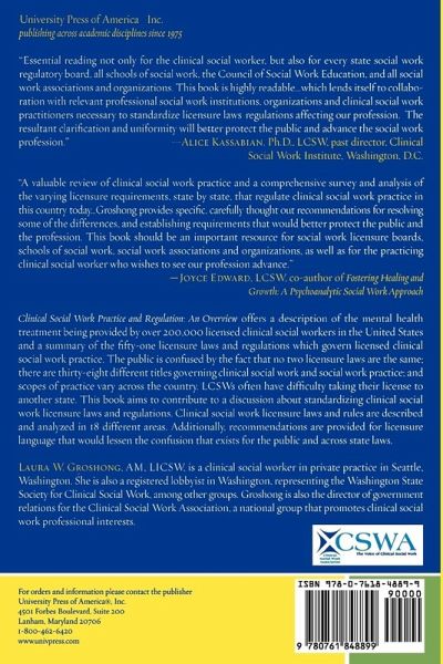 This book describes the mental health treatment being provided by over 200,000 licensed clinical social workers in the United States and a summary of the fifty-one licensure laws and regulations which govern licensed clinical social work practice. The author seeks to standardize clinical social work licensure laws and regulations.