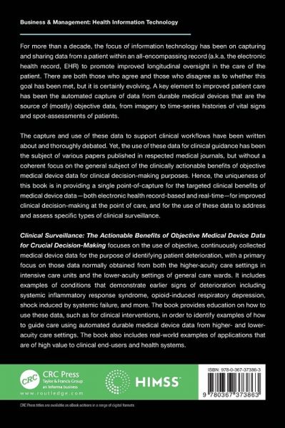 For more than a decade, the focus of information technology has been on capturing and sharing data from a patient within an all-encompassing record (a.k.a. the electronic health record, EHR), to promote improved longitudinal oversight in the care of the patient. There are both those who agree and those who disagree as to whether this goal has been met, but it is certainly evolving. A key element to improved patient care has been the automated capture of data from durable medical devices that are the source of (mostly) objective data, from imagery to time-series histories of vital signs and spot-assessments of patients. The capture and use of these data to support clinical workflows have been written about and thoroughly debated. Yet, the use of these data for clinical guidance has been the subject of various papers published in respected medical journals, but without a coherent focus on the general subject of the clinically actionable benefits of objective medical device data for clinical decision-making purposes. Hence, the uniqueness of this book is in providing a single point-of-capture for the targeted clinical benefits of medical device data--both electronic- health-record-based and real-time--for improved clinical decision-making at the point of care, and for the use of these data to address and assess specific types of clinical surveillance. Clinical Surveillance: The Actionable Benefits of Objective Medical Device Data for Crucial Decision-Making focuses on the use of objective, continuously collected medical device data for the purpose of identifying patient deterioration, with a primary focus on those data normally obtained from both the higher-acuity care settings in intensive care units and the lower-acuity settings of general care wards. It includes examples of conditions that demonstrate earlier signs of deterioration including systemic inflammatory response syndrome, opioid-induced respiratory depression, shock induced by systemic failure, and more. The book provides education on how to use these data, such as for clinical interventions, in order to identify examples of how to guide care using automated durable medical device data from higher- and lower-acuity care settings. The book also includes real-world examples of applications that are of high value to clinical end-users and health systems.