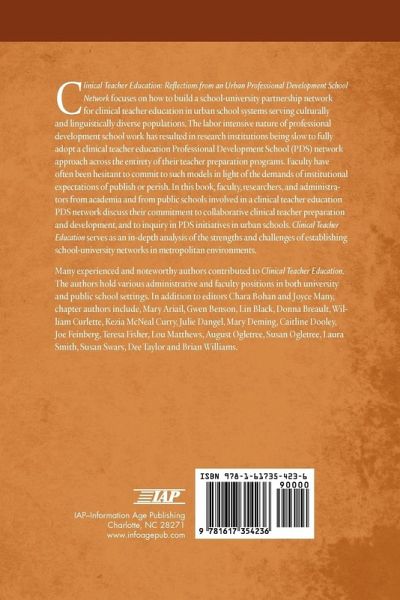 A volume in Readings in Educational Thought Series Editors Andrew J. Milson, Chara Haeussler Bohan, Perry L. Glanzer and J. Wesley Null Clinical Teacher Education focuses on how to build a school-university partnership network for clinical teacher education in urban school systems serving culturally and linguistically diverse populations. The labor intensive nature of professional development school work has resulted in research institutions being slow to fully adopt a clinical teacher education Professional Development School (PDS) network approach across the entirety of their teacher preparation programs. Faculty have often been hesitant to commit to such models in light of the demands of institutional expectations of publish or perish. In this book, faculty, researchers, and administrators from academia and from public schools involved in a clinical teacher education PDS network discuss their commitment to collaborative clinical teacher preparation and development, and to inquiry in PDS initiatives in urban schools. Clinical Teacher Education serves as an in-depth analysis of the strengths and challenges of establishing school-university networks in metropolitan environments. Many experienced and noteworthy authors contributed to Clinical Teacher Education. The authors hold various administrative and faculty positions in both university and public school settings. In addition to editors Chara Bohan and Joyce Many, chapter authors include, Mary Ariail, Gwen Benson, Lin Black, Donna Breault, William Curlette, Kezia McNeal Curry, Julie Dangel, Mary Deming, Caitline Dooley, Joe Feinberg, Teresa Fisher, Lou Matthews, August Ogletree, Susan Ogletree, Laura Smith, Susan Swars, Dee Taylor and Brian Williams. In addition, the chapters address a host of issues that arise when working in a large, urban school-university clinical teacher education network. Nine chapters include the following topics: Chapter 1, "Understanding the Complexities Inherent in Large Scale Implementation of the PDS Model by an Urban Research Institution," Chapter 2, "Professional Development Schools: History, Development, and Content Research," Chapter 3, "The Work and Insights of Professional Development School Boundary Spanners," Chapter 4, "Possibilities for Clinical Teacher Education: Four Stories of Field-based Courses Taught at Professional Development School Sites," Chapter 5, "Examining PDS Partnerships with Survey Items: Assessing Perception of Fidelity of Implementation Using the NCATE PDS Standards, " Chapter 6, "Integrating Inquiry in Clinical Teacher Education Initiatives Across a PDS Network," Chapter 7, "An Approach to Increasing Student Achievement: Teacher-Intern-Professor Groups with Anchor Action Research," Chapter 8, "Making a Difference in Teacher Development and High Quality Teaching," and Chapter 9, "Partnership Building in a Context of Change."