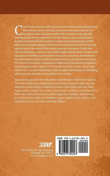 A volume in Readings in Educational Thought Series Editors Andrew J. Milson, Chara Haeussler Bohan, Perry L. Glanzer and J. Wesley Null Clinical Teacher Education focuses on how to build a school-university partnership network for clinical teacher education in urban school systems serving culturally and linguistically diverse populations. The labor intensive nature of professional development school work has resulted in research institutions being slow to fully adopt a clinical teacher education Professional Development School (PDS) network approach across the entirety of their teacher preparation programs. Faculty have often been hesitant to commit to such models in light of the demands of institutional expectations of publish or perish. In this book, faculty, researchers, and administrators from academia and from public schools involved in a clinical teacher education PDS network discuss their commitment to collaborative clinical teacher preparation and development, and to inquiry in PDS initiatives in urban schools. Clinical Teacher Education serves as an in-depth analysis of the strengths and challenges of establishing school-university networks in metropolitan environments. Many experienced and noteworthy authors contributed to Clinical Teacher Education. The authors hold various administrative and faculty positions in both university and public school settings. In addition to editors Chara Bohan and Joyce Many, chapter authors include, Mary Ariail, Gwen Benson, Lin Black, Donna Breault, William Curlette, Kezia McNeal Curry, Julie Dangel, Mary Deming, Caitline Dooley, Joe Feinberg, Teresa Fisher, Lou Matthews, August Ogletree, Susan Ogletree, Laura Smith, Susan Swars, Dee Taylor and Brian Williams. In addition, the chapters address a host of issues that arise when working in a large, urban school-university clinical teacher education network. Nine chapters include the following topics: Chapter 1, "Understanding the Complexities Inherent in Large Scale Implementation of the PDS Model by an Urban Research Institution," Chapter 2, "Professional Development Schools: History, Development, and Content Research," Chapter 3, "The Work and Insights of Professional Development School Boundary Spanners," Chapter 4, "Possibilities for Clinical Teacher Education: Four Stories of Field-based Courses Taught at Professional Development School Sites," Chapter 5, "Examining PDS Partnerships with Survey Items: Assessing Perception of Fidelity of Implementation Using the NCATE PDS Standards, " Chapter 6, "Integrating Inquiry in Clinical Teacher Education Initiatives Across a PDS Network," Chapter 7, "An Approach to Increasing Student Achievement: Teacher-Intern-Professor Groups with Anchor Action Research," Chapter 8, "Making a Difference in Teacher Development and High Quality Teaching," and Chapter 9, "Partnership Building in a Context of Change."