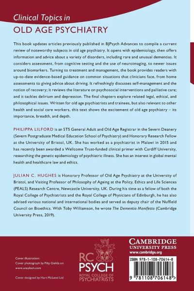 Preface; Acknowledgement; Editors' note; Abbreviations; Introductory comments by Julian C. Hughes; Part I. Epidemiology and Types of Disorders: 1. Epidemiology and mental health in old age Philippa Lilford and Julian C Hughes; 2. Vascular dementia Hugh Series and Margaret Esiri; 3. Young-onset dementias Kate Jefferies and Niruj Agrawal; 4. Rare and unusual dementias Susham Gupta, Olivia Fiertag, Thanakumar Thanulingam, Elena Ros, Bryan Strange and James Warner; 5. Mania in late life Felicity Richards and Martin Curtice; 6. Alcohol misuse in older people Rahul Rao and Ilana B. Crome; 7. Drug misuse in older people: old problems and new challenges Ajay Wagle and Vellingiri Raja Badrakalimuthu; 8. Mental health in Parkinson's disease Shoned Jones, Kelli M. Torsney, Lily Scourfield, Katie Berryman and Emily J. Henderson; Part II. Assessment and Investigations: 9. The home assessment in old age psychiatry: a practical guide Bradley Ng and Martin Atkins; 10. Driving in dementia: a clinician's guide Sarah Wilson and Gill Pinner; 11. Mini-mental state examination for the detection and prediction of Dementia in people with and without mild cognitive impairment Alex J. Mitchell; 12. Biomarkers and the diagnosis of preclinical Alzheimer's disease Philippa Lilford and Julian C. Hughes; 13. To scan or not to scan: neuroimaging in mild cognitive impairment and dementia Victoria Sullivan, Biswadeep Majumdar, Anna Richman and Sobhan Vinjamuri; Part III. Approaches to Management: 14. Supporting self-management in early dementia: a contribution towards 'living well'? Jo Cheffey, Laura Hill and Glenn Roberts; 15. What can person-centred care in dementia learn from the recovery movement? Laura Hill, Glenn Roberts and Rachel Perkins; 16. Psychosocial interventions in dementia Andrew Kiridoshi; 17. Palliative care in dementia: issues and evidence Julian C Hughes, David Jolley, Alice Jordan and Elizabeth L. Sampson; 18. Review of treatment for late-life depression Katherine Hay, Will Stageman and Charlotte L. Allan; 19. Reducing the healthcare burden of delirium: the challenge of developing more cognitive-friendly services David J. Meagher, Henry O'Connell, Walter Cullen and Dimitrios Adamis; 20. Controlling the confusion: using barrier analysis in the care home sector Robert Colgate, Alison Turner and Danika Rafferty; Part IV. Law, Ethics, and Philosophy: 21. Mental health laws from all UK jurisdictions Carole Burrell and Charlotte Emmett; 22. Deprivation of liberty: where are we now? Nick Brindle and Christian Walsh; 23. Residence capacity: its nature and assessment Julian C. Hughes, Marie Poole, Stephen J. Louw, Helen Greener and Charlotte Emmett; 24. Understanding the person with dementia: a clinico-philosophical case discussion Julian C. Hughes and Aileen Beatty; Concluding reflections by Philippa Lilford; Index.