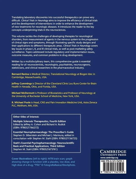 Preface; Part I. The Role of Clinical Trials in Therapy Development: 1. The impact of clinical trials in neurology E. Ray Dorsey and S. Claiborne Johnston; 2. The sequence of clinical development Michael Poole; 3. Unique challenges in the development of therapies for neurological disorders Gilmore N. O'Neill; Part II. Concepts in Biostatistics and Clinical Measurement: 4. Fundamentals of biostatistics Judith Bebchuk and Janet Wittes; 5. Bias and random error Susan S. Ellenberg and Jacqueline A. French; 6. Approaches to data analysis William R. Clarke; 7. Selecting outcome measures Robert G. Holloway and Andrew D. Siderowf; Part III. Special Study Designs and Methods for Data Monitoring: 8. Selection and futility designs Bruce Levin; 9. Adaptive designs across stages of therapeutic development Christopher S. Coffey; 10. Crossover designs Mary E. Putt; 11. Two period designs for evaluation of disease-modifying treatments Michael P. McDermott; 12. Enrichment designs Kathryn M. Kellogg and John Markman; 13. Non-inferiority trials Rick Chappell; 14. Monitoring of clinical trials: interim monitoring, data monitoring committees, and group sequential methods applied to neurology Rickey E. Carter and Robert F. Woolson; 15. Clinical approaches to post-marketing drug safety assessment Gerald J. Dal Pan; Part IV. Ethical Issues: 16. Ethics in clinical trials involving the central nervous system: risk, benefit, justice, and integrity Jonathan Kimmelman; 17. The informed consent process: compliance and beyond Scott Y. H. Kim; Part V. Regulatory Perspectives: 18. Evidentiary standards for neurologic drugs and biologics approval Russell Katz; 19. Premarket reviews of neurological devices Eric A. Mann and Peter G. Como; Part VI. Clinical Trials in Common Neurological Disorders: 20. Parkinson's disease Karl D. Kieburtz and Jordan Elm; 21. Alzheimer's disease Joshua Grill and Jeffrey Cummings; 22. Acute ischemic stroke Karen C. Johnston, Devin L. Brown and Yuko Y. Palesch; 23. Multiple sclerosis Richard A. Rudick, Elizabeth Fisher and Gary R. Cutter; 24. Amytrophic lateral sclerosis (ALS) Nazem Atassi, David Schoenfeld and Merit Cudkowicz; 25. Epilepsy John R. Pollard, Susan S. Ellenberg and Jacqueline A. French; 26. Insomnia Michael E. Yurcheshen, Changyong Feng and J. Todd Arnedt; Part VII. Clinical Trial Planning and Implementation: 27. Clinical trial planning: an academic and industry perspective Cornelia L. Kamp and Jean-Michel Germain; 28. Clinical trial implementation, analysis and reporting: an academic and industry perspective Cornelia L. Kamp and Jean-Michel Germain; 29. Academic-industry collaborations and compliance issues Troy Morgan; Index.