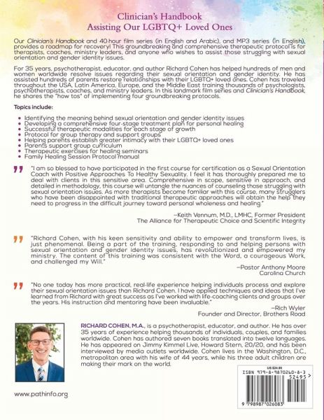 Our 250-page Clinician's Handbook and 40-hour film series (in English and Arabic), and MP3 series (in English), provides a roadmap for recovery. This groundbreaking and comprehensive therapeutic protocol is for therapists, coaches, ministry leaders, and anyone who wishes to assist those struggling with sexual orientation and gender identity issues. ¿ For 35 years, psychotherapist, educator, and author Richard Cohen has helped hundreds of men and women worldwide resolve issues regarding their sexual orientation and gender identity. He has assisted hundreds of parents restore relationships with their LGBTQ+ loved ones. Cohen has traveled throughout the USA, Latin America, Europe, and the Middle East training thousands of psychologists, psychotherapists, coaches, and ministry leaders. In this landmark handbook and film series, he shares the "how tos" of implementing four groundbreaking protocols. Topics include: Identifying the meaning behind sexual orientation and gender identity issues Developing a comprehensive four-stage treatment plan for personal healing Successful therapeutic modalities for each stage of healing Protocol for group therapy and support groups Helping parents establish greater intimacy with their LGBTQ+ loved ones Parents support group curriculum Therapeutic exercises for healing seminars Family Healing Session Protocol manual I am so blessed to have participated in the first course for certification as a Sexual Orientation Coach. I feel it has thoroughly prepared me to deal with clients in this sensitive area. Comprehensive in scope, sensitive in approach, and detailed in methodology, this course will untangle the nuances of counseling those struggling with sexual orientation issues. Keith Vennum, M.D., LMHC, Former President of The Alliance for Therapeutic Choice and Scientific Integrity Richard Cohen, with his keen sensitivity and ability to empower and transform lives, is just phenomenal. Being a part of the training, responding to, and helping persons with sexual orientation and gender identity issues, has revolutionized and empowered my ministry. The content of this training was consistent with the Word, a courageous Work, and challenged my Will. Pastor Anthony Moore, Carolina Church No one today has more practical, real-life experience helping individuals process and explore their sexual orientation issues than Richard Cohen. I have applied techniques and ideas that I've learned from Richard with great success as I've worked with life-coaching clients and groups over the years. His instruction and mentoring have been invaluable. Rich Wyler, Founder and Director, Brothers Road