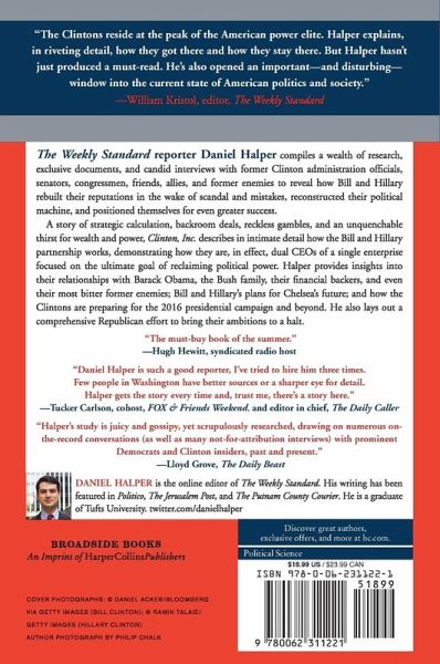 Weekly Standard editor Daniel Halper provides a meticulously researched account of the brilliant calculations, secret deals, and occasionally treacherous maneuverings that led to the Clintons’ return to political prominence. In the twelve years since the Clintons left the White House, they have gone from being virtually penniless to multi-millionaires, and are arguably the most popular politicians in America—respected and feared by Republicans and Democrats alike. But behind that rise is a never-before-told story of strategic cleverness, reckless gambles, and an unquenchable thirst for political power. Investigative reporter Daniel Halper uses a wealth of research, exclusive documents, and detailed interviews with close friends, allies, and enemies of the Clintons to reveal the strategy they used and the deals they made to turn their political fortunes around. Clinton, Inc. exposes the relationship between President Obama, the Bush family, and the Clintons—and what it means for the future; how Bill and Hillary are laying the groundwork for the upcoming presidential campaign; how Vice President Biden and other Democrats are trying to maneuver around her; Chelsea’ s political future; the Clintons’ skillful media management; the Clintons’ marriage and why it has survived; and an inside look at the Clinton’s financial backers and hidden corporate enterprises. Clinton, Inc. is the key to understanding America’s most powerful political couple. With 16 pages of photos.