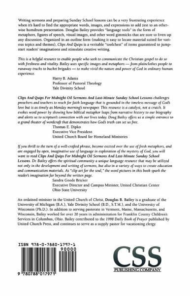Writing sermons and preparing Sunday school lessons can be a very frustrating experience when you just can't seem to find the appropriate words, images, and expressions to add zest to an otherwise humdrum presentation. Douglas Bailey's collection of "verbal clip art" -- metaphors, figures of speech, visual images, and other word gimmicks -- is sure to liven up any discussion. Organized in an outline format (making it easy to locate material suited for various topics and themes), Clips And Quips is a veritable "toolchest" of items guaranteed to jumpstart the imagination and stimulate creative writing. This is a helpful resource to enable people who seek to communicate the Christian gospel to do so with freshness and vitality. Bailey uses specific images and metaphors -- from plainclothes people to runaway trucks to bucket brigades -- to make vivid the nature and power of God in ordinary human experience. Harry B. Adams Professor of Pastoral Theology Yale Divinity School Clips And Quips For Midnight Oil Sermons And Last-Minute Sunday School Lessons challenges preachers and teachers to reach for faith language that is grounded in the timeless message of God's love but is as timely as Monday morning's newspaper. This resource is a catalyst, not a crutch. It evokes word power by showing how biblical metaphor leaps from narrative history to our biography and alerts us to scripture's connection with our lives today. Doug Bailey offers us a simple entrance to a grand theater of wordcraft that demonstrates how God's truth can set us free. Thomas E. Dipko Executive Vice President United Church Board for Homeland Ministries If you thrill to the turn of a well-crafted phrase, become excited over the use of fresh metaphors, and are engaged by open, imaginative use of language in exploration of the mystery of God, you will want to read Clips And Quips For Midnight Oil Sermons And Last-Minute Sunday School Lessons. Dr. Bailey offers the spiritual community a unique language resource that may be utilized not only in the development and writing of sermons, but also in a variety of ways to create education and communication materials. As "clip art for the soul," the word pictures in this book spark the reader's imagination far beyond the written page. Sandra Goode Bricker Executive Director and Campus Minister, United Christian Center Ohio State University An ordained minister in the United Church of Christ, Douglas B. Bailey is a graduate of the University of Michigan (B.A.), Yale Divinity School (B.D., S.T.M.), and the University of Wisconsin (Ph.D.). In addition to serving pastorates in Vermont, Maine, Massachusetts, and Wisconsin, Bailey spent over 20 years in administration for Franklin County Children's Services in Columbus, Ohio. Bailey contributed to the 1998 Daily Book of Prayer published by United Church Press, and continues to serve as a supply pastor for vacationing clergy.