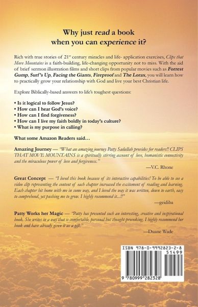Why just read a book when you can experience it? Take an interactive discipleship journey with the aid of 23 thought-provoking and inspirational film clips that will move you to discover your territory of Christian Impact. Rich with true stories of 21st century miracles and life-application exercises, Clips that Move Mountains is a, faith-building, life-changing opportunity not to miss. With the aid of brief sermon illustration films and short clips from popular movies such as Forrest Gump, Surf’s Up, Facing the Giants, Fireproof, the Lorax you will learn how to practically grow your relationship with God and live your best Christian life. Explore Biblically-based answers to life’s toughest questions like: • Is it logical to follow Jesus? • How can I hear God’s voice? • How can I find forgiveness? • How can I live my faith boldly in today’s culture? • What is my purpose in calling? What some Amazon Readers said… Amazing Journey "What an amazing journey Patty Sadallah provides for readers!! CLIPS THAT MOVE MOUNTAINS is a spiritually stirring account of love, humanistic connectivity and the miraculous power of love and forgiveness." ~ v.c.Rhone Great Concept "I loved this book because of its interactive capabilities! To be able to see a video clip representing the content of each chapter increased the excitement of reading and learning. Each chapter hit home with me in some way, and I loved the way it was written, down to earth, easy to comprehend, yet pushing me to grow. I highly recommend it...!!" ~ geidiba Patty Works her Magic "Patty has presented such an interesting, creative and inspirational book. She writes in a way that is comfortable, personal but thought-provoking. I highly recommend her book and have already given it as a gift."~ Duane Wade