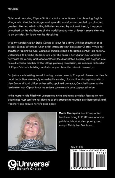 Quiet and peaceful, Clipton St Marks looks the epitome of a charming English village, with thatched cottages and splendid mansions surrounded by cultivated gardens. Nestled within rolling hillsides wooded by oak and beech, it appears untouched by the challenges of the world beyond-or at least it seems that way to an outsider. But looks can be deceiving. Wealthy London widow Stella Campbell is out for a drive with her chauffeur on a breezy Sunday afternoon when a flat interrupts their plans near Clipton. While her chauffeur repairs the tyre, Campbell stumbles upon a forgotten, century-old rectory. Determined to breathe life back into what she thinks is her Shangri-La, Campbell purchases the rectory and soon transforms the dilapidated building into a grand new home. Elected a member of the village planning commission, she oversees restoration of Clipton's historic buildings and wins respect from the reticent community. But just as she is settling in and focusing on new projects, Campbell discovers a friend's dead body. Now unwittingly enmeshed in murder, blackmail, and conspiracy with a New Scotland Yard officer as her self-appointed protector, Campbell comes to the realization that Clipton is not the sedate community it once appeared to be. In this mystery tale filled with unexpected twists and turns, a widow focused on new beginnings must confront her demons as she attempts to triumph over heartbreak and treachery and rebuild her life once again.