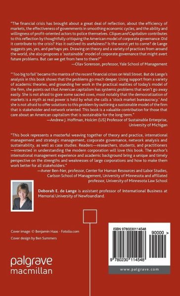 "The financial crisis has brought about a great deal of reflection, about the efficiency of markets, the effectiveness of governments in smoothing economic cycles, and the ability and willingness of profit-oriented actors to police themselves. Cliques and Capitalism contributes to this reflection by thoughtfully critiquing the American model of corporate governance: Did it contribute to the crisis? Has it outlived its usefulness? Is the worst yet to come? de Lange suggests yes, yes, and perhaps yes. Drawing on theory and a variety of practices from around the world, she also proposes a 'sustainable' model of corporate governance that might avert future problems. But can we get from here to there?" - Olav Sorenson, Professor, Yale School of Management