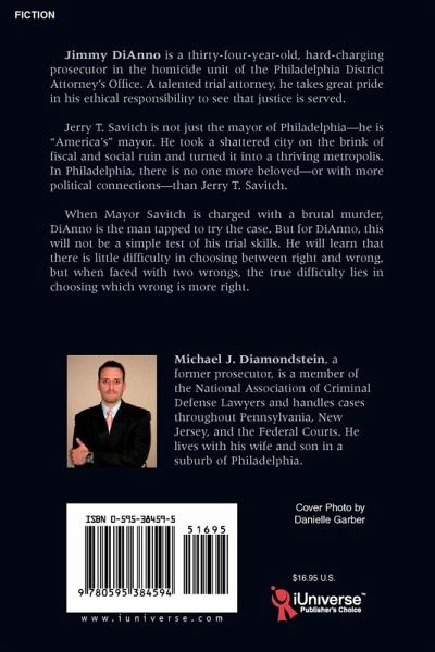 Jimmy DiAnno is a thirty-four-year-old, hard-charging prosecutor in the homicide unit of the Philadelphia District Attorney's Office. A talented trial attorney, he takes great pride in his ethical responsibility to see that justice is served. Jerry T. Savitch is not just the mayor of Philadelphia-he is "America's" mayor. He took a shattered city on the brink of fiscal and social ruin and turned it into a thriving metropolis. In Philadelphia, there is no one more beloved-or with more political connections-than Jerry T. Savitch. When Mayor Savitch is charged with a brutal murder, DiAnno is the man tapped to try the case. But for DiAnno, this will not be a simple test of his trial skills. He will learn that there is little difficulty in choosing between right and wrong; but, when faced with two wrongs, the true difficulty lies in choosing which wrong is more right.