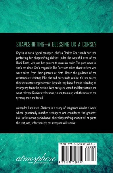 Shapeshifting-a Blessing or a Curse? Crystia is not a typical teenager-she's a Cloaker. She spends her time perfecting her shapeshifting abilities under the watchful eyes of the Black Coats, who use her powers to maintain order. The good news is, she's not alone. She's trapped in The Port with other shapeshifters who were taken from their parents at birth. Under the guidance of the mysteriously tempting Pike, she and her friends realize it's time to end their involuntary imprisonment. Little do they know, Simone is leading an insurgency from the outside. With her quick-witted and fiery nature she won't tolerate Cloaker exploitation, so she teams up with them to end the tyranny once and for all. Alexandra Lapointe's Cloakers is a story of vengeance amidst a world where genetically modified teenagers are considered the greatest evil. In this action-packed novel, their shapeshifting abilities will be put to the test, and, unfortunately, not everyone will survive.