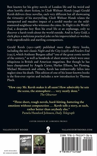 "How easy Mr. Kersh makes it all seem! How admirably he sets the scene, the atmosphere . . . very neatly done." - The Observer "Three short, rough novels, hard-hitting, battering the emotions without compunction . . . Kersh tells a story, as such, rather better than anybody else." - Pamela Hansford Johnson, Daily Telegraph Best known for his gritty novels of London life and his weird and often horrific short fiction, in Clock Without Hands (1949) Gerald Kersh delivers three novellas, each very different but all showcasing the virtuosity of his storytelling. Clock Without Hands relates the unexpected and macabre impact of a sordid murder on the mild-mannered neighbour who witnesses the crime. In Flight to the World's End, a desperate boy flees his cruel life at an orphanage, only to discover a harsh truth about the world outside. And in Fairy Gold, a clerk plays a malicious practical joke on his impoverished co-worker, with unpredictable and startling consequences. Gerald Kersh (1911-1968) published more than thirty books, including the noir classic Night and the City (1938) and Fowlers End (1957), which Anthony Burgess called "one of the great comic novels of the century," as well as hundreds of short stories which were once ubiquitous in British and American magazines. But though he has been championed by Angela Carter, Harlan Ellison, Ian Fleming, Michael Moorcock and others, Kersh has undeservedly fallen into neglect since his death. This edition of one of his lesser-known books is the first-ever reprint and includes a new introduction by Thomas Pluck.