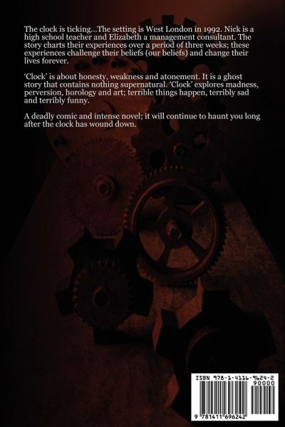 The clock is ticking...The setting is West London in 1992. Nick is a high school teacher and Elizabeth is a management consultant. The story charts their experiences over a period of three weeks; these experiences challenge their beliefs (our beliefs) and change their lives forever. 'Clock' is about honesty, weakness and atonement. It is a ghost story that contains nothing supernatural. 'Clock explores madness, perversion, horology and art; terrible things happen, terribly sad and terribly funny. A deadly comic and intense novel; it will continue to haunt you long after the clock has wound down.